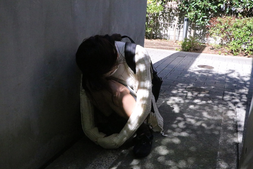 22:26~ A woman is lying in a ruined place. Remove the mask while rubbing your chest.