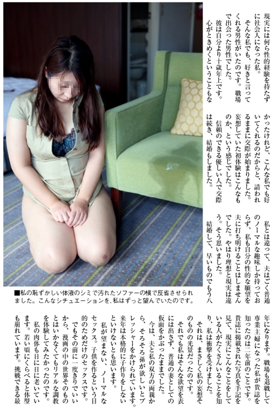 This is a video of the SM training experience of a married woman who applied for SM magazine. Rieko (pseudonym) is a married woman who dreamed of training from a young age where she was tied up,, tormented by pain and pleasure. She had no real sexual experience, and she was in agony and repeating her fantasies. The man I had a relationship with for the first time was a man with normal sexual habits, but I was attracted by his sincerity and kindness and married him. She sealed her masochistic habits for the sake of her beloved husband and played a normal, good wife. Eighth year of marriage, it's time to have a child... When she thought about it, she couldn't end her delusion as a delusion, so she contacted the editorial department of SM magazine... Bondage, squirting with pleasure blame, blame, altar candle blame, spanking ... It is a video that clearly captures the appearance of a married woman biting the pleasure of masochism in her first training experience that she has continued to dream of.