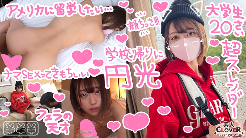 【りお/20歳/大学生】この企画はお金が欲しい女の子と繋がり、援助してハメ撮りする双方WINWINな企画でございます。今回の女の子は友達と遊ぶ前に円光しちゃうとんでもないエロ娘な大学生の『りお』ちゃん。バスケサークルに所属していて、服装はかなりボーイッシュな感じ♪円光の理由はライブの参戦費用と留学のためということでかなり円光に勤しんでいる感じでした。オーバーサイズのパーカーを脱いでもらうと色白のスレンダーボディが現れ、陰部はツルツルの超綺麗なパイパンマ○コ。シャワーを浴びようと二人でお風呂場に行きましたが、りおちゃんの裸体に思わず息子はバキバキになってしまったのでフェラ抜きをお願い→戸惑いながらも咥えてくれて舌を沢山動かすペロペロフェラで堪らず大量に口内射精してしまいました。部屋に戻って椅子にM字開脚で座らせ、パイパンマ○コを手マンとクンニでたっぷりほぐしてあげると愛液がドバドバ止まりません。そのまま挿入を試みるもゴムを取り出して頑なに生挿入を避けようとするりおちゃん(ちゃんと避妊してえらい!)。しかしこの後、プラス料金を支払われ、生ハメを許し、中出し絶頂SEXで快楽漬けにされるとは思いもしないりおちゃんなのでした…。 #女子大生#色白#パイパン#マスク#口内射精#エロコス#中出し【¥¥¥】B:82 W:55 H:83