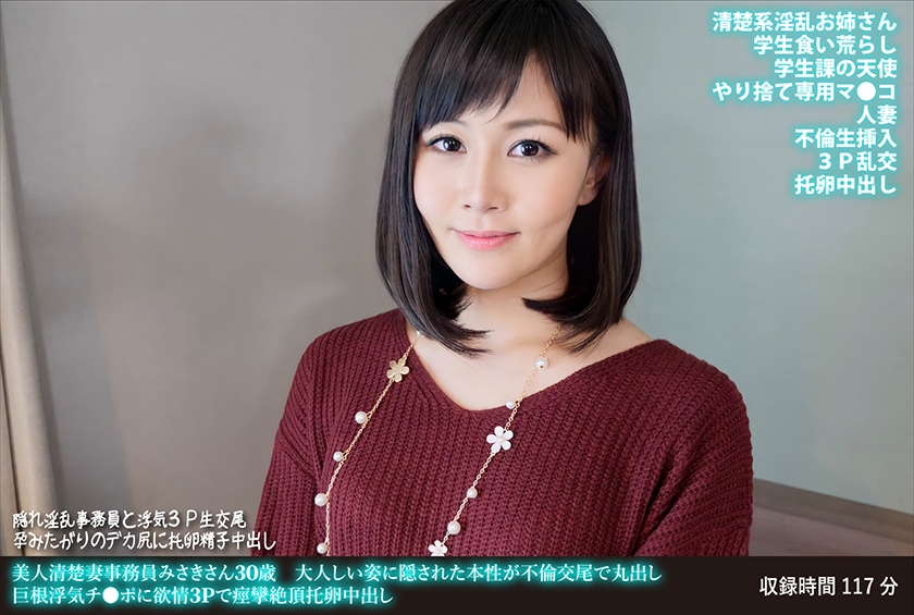 某有名大学で事務として働いている人妻のみさきさん。清楚に見えますが大学では学生を色仕掛けでからかう魔性のお姉さんです。デカ尻にぷっくり乳首で下の毛は薄いタイプ。ほっぺたが亀頭の形に膨らむ四つん這いフェラんでチ●ポにご奉仕。アソコを擦りつけるようなグラインド騎乗位とバックで膣奥を刺されて痙攣絶頂。窓際の立ちバックをして恥ずかしがりながらスリルに悶えてイキまくり。男2人がかりで体中の穴を弄り犯●れて何度も絶頂。本気のアヘ声で喘ぎながら生挿入されたマ●コで中出しをおねだり。浮気精子を膣奥射精されて托卵受精完了です。